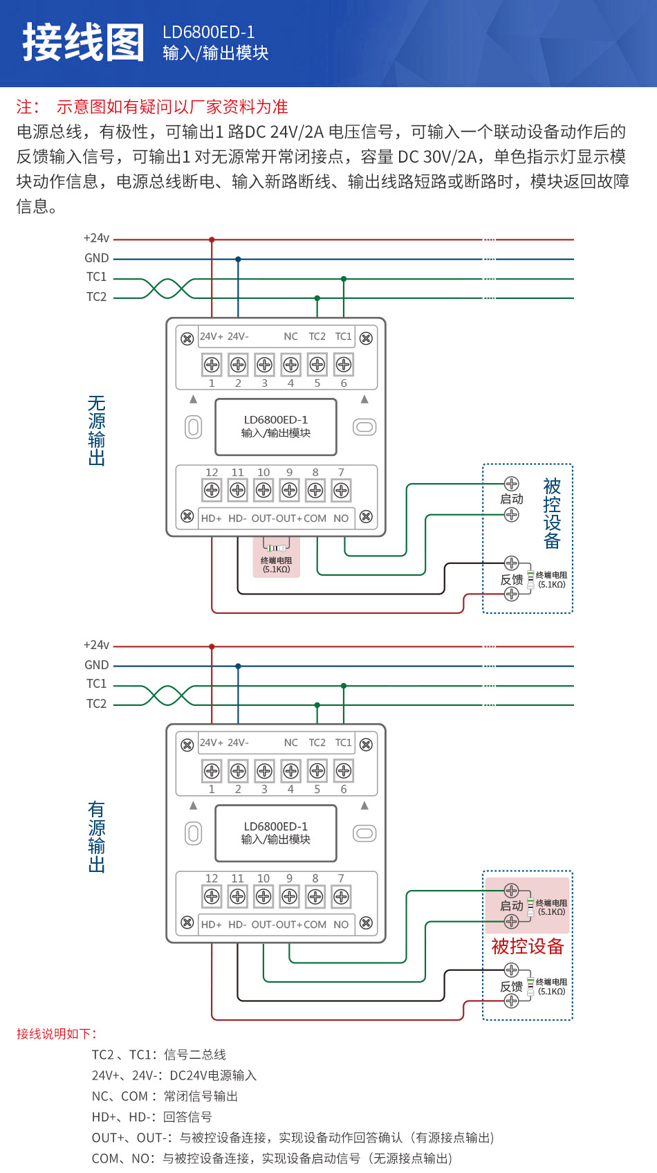 LD6800ED-1輸入/輸出模塊與E/EN/EL系列火災(zāi)報警控制器配合使用。LD6800ED-1輸入/輸出模塊通過二總線與E/EN/EL系列控制器連接,控制器通過二總線查詢模塊節(jié)點狀態(tài)、設(shè)置模塊節(jié)點參數(shù)、控制模塊啟動輸出;模塊實時檢測輸入信號、輸入/輸出線路狀態(tài),當(dāng)出現(xiàn)反饋輸入或者輸入/輸出線路故障時,模塊通過二總線上傳反饋或者故障信號。
